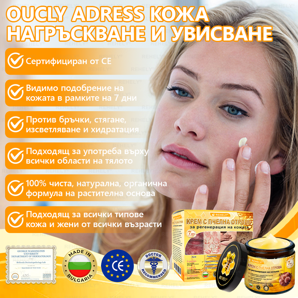 REHELY® Крем с пчелна отрова за възстановяване на кожата ефективно се справя с всички проблеми, свързани с отпусната кожа, бръчки и други кожни несъвършенства!